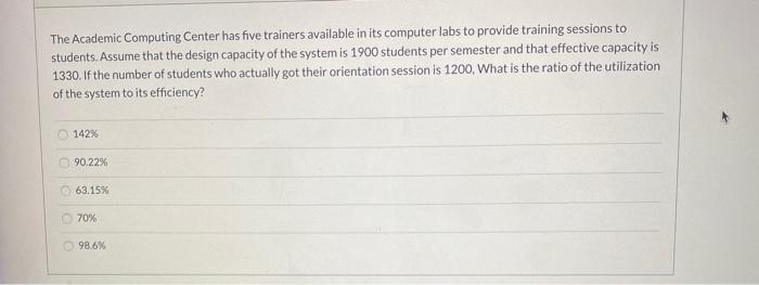 The Academic Computing Center has five trainers available in its computer labs to provide training sessions to students. 11 The Academic Computing Center has five trainers available in. Assume that the design capacity of the system is 1900 students per semester and that effective capacity equals 90 of design capacity.